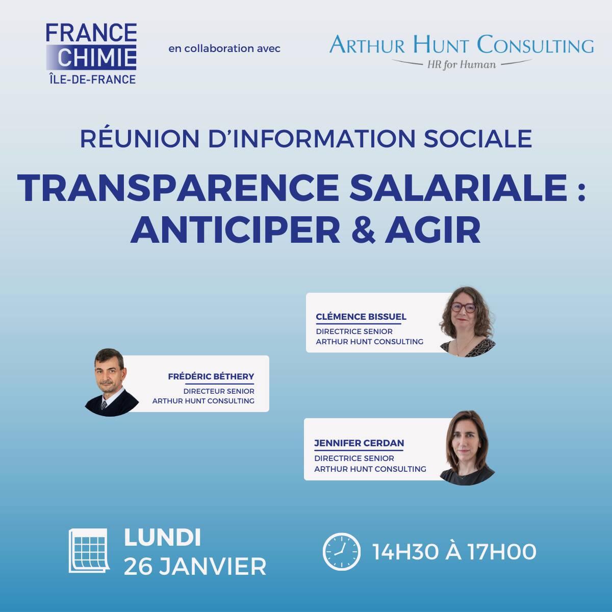 Dans ce contexte, nous avons le plaisir de vous inviter à la REUNION D'INFORMATION SOCIALE, organisée par le Département Social et Relations Humaines de FRANCE CHIMIE ILE-DE-FRANCE, en collaboration avec le cabinet ARTHUR HUNT CONSULTING, sur le thème :