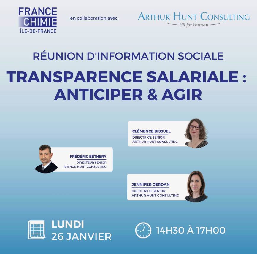 Dans ce contexte, nous avons le plaisir de vous inviter à la REUNION D'INFORMATION SOCIALE, organisée par le Département Social et Relations Humaines de FRANCE CHIMIE ILE-DE-FRANCE, en collaboration avec le cabinet ARTHUR HUNT CONSULTING, sur le thème :